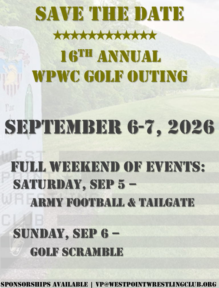 Apr 13, 2026 1 min read Golf26 - Save the Date We're Baaaack! Join us for the weekend:o Saturday, Sep 5 – WPWC Tailgate for the Army Football Game vs Bryanto Sunday, Sep 6 – 16th Annual West Point Wrestling Golf Scramble
